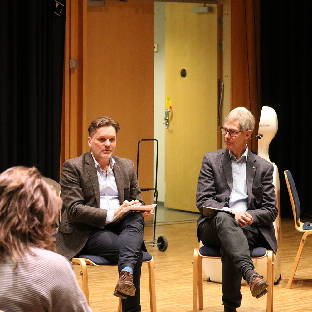 Efter lunch var det dags att träffa Rikard Gateau, konstnärlig verksamhetschef för Västmanlandsmusiken och musikproducent Christofer Ekströmer. Vi fick lära oss mer om verksamheten genom en inblick i uppdragen för konserthuset, orkestern och dansresidenset. Vi pratade sedan vidare om bland annat utmaningen med att arbeta med en politisk tillsatt styrelse, möjligheterna som ges av engagerade sponsorer och om vikten av att nå ut på landsbygden. Samtalet avslutades med ett löfte från Rikard Gateau om att ta klimatfrågan på största allvar.